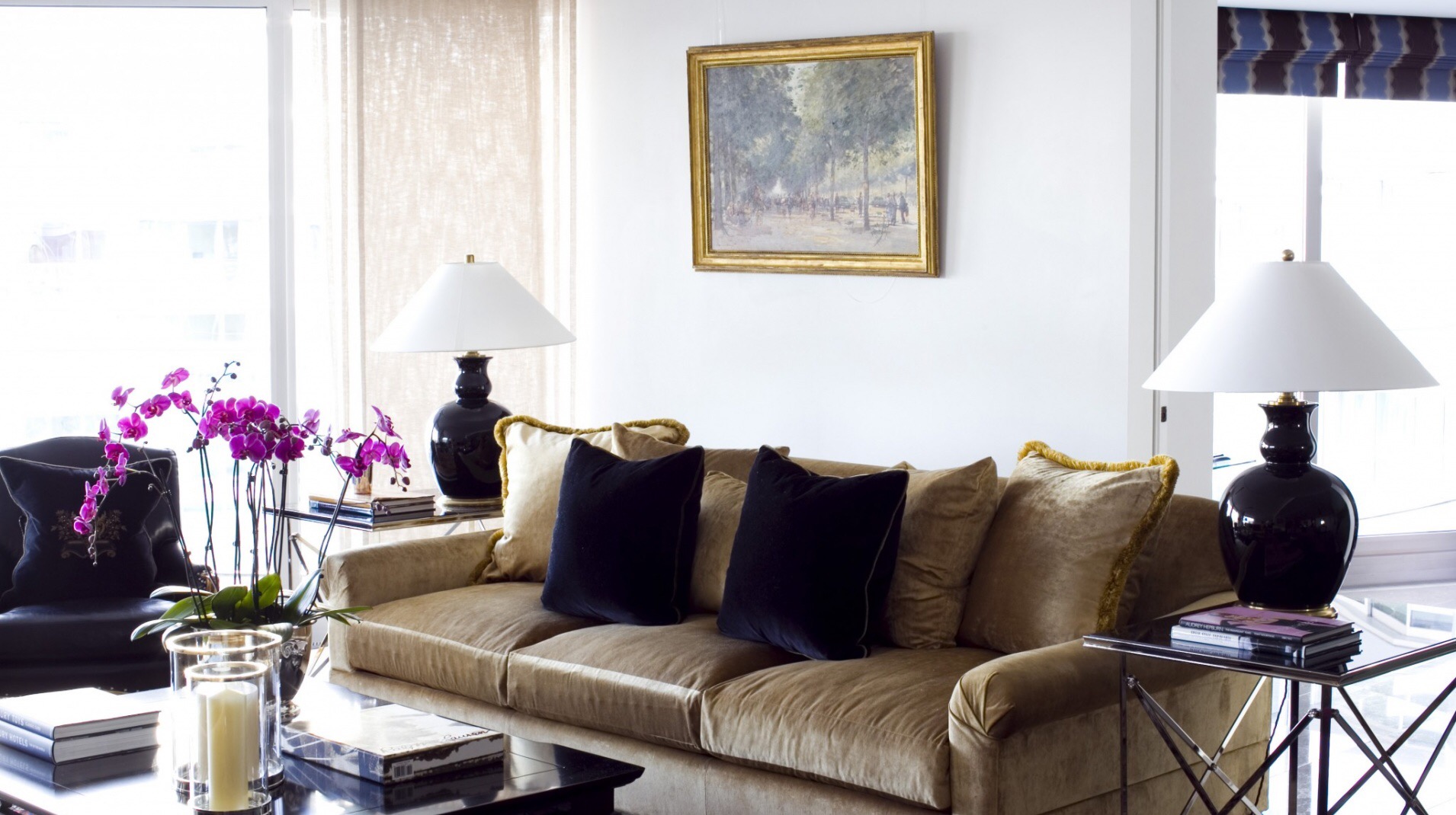#RiversideViewI love this open plan apartment with hints of chinoiserie such as the blue and white vases and black glossy furnishings. Like every design it has to be versatile and Maurizio has managed this by using white linens in the summer and sumptuous fabrics in decadent colours of gold’s, purples and blues in the winter to provide the space with warmth and depth.