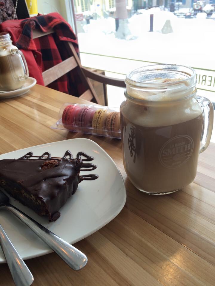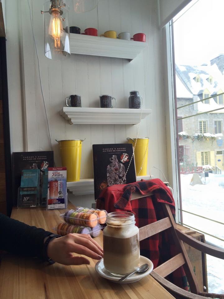 Located across from the oldest church in North America, the church of Our Lady of Victories is the small coffee shop of La Maison Smith. Tucked away at the side of small square this beautiful place was a savour in the ice cold temperatures of the outside. As I sat at the window looking out on to the square it was like a scene from a Christmas card. This small establishment doesn’t disappoint having an array of macarons, pastries, cakes and coffees. You can watch them outside as they drop maple syrup into the snow to harden, scoop them up on sticks and eat the toffee textured delight as it slowly melts again. I opted for a lovely chocolate cake (you can see a common theme here) and a maple syrup latte beautiful served in mason jar style mugs which I also purchased.