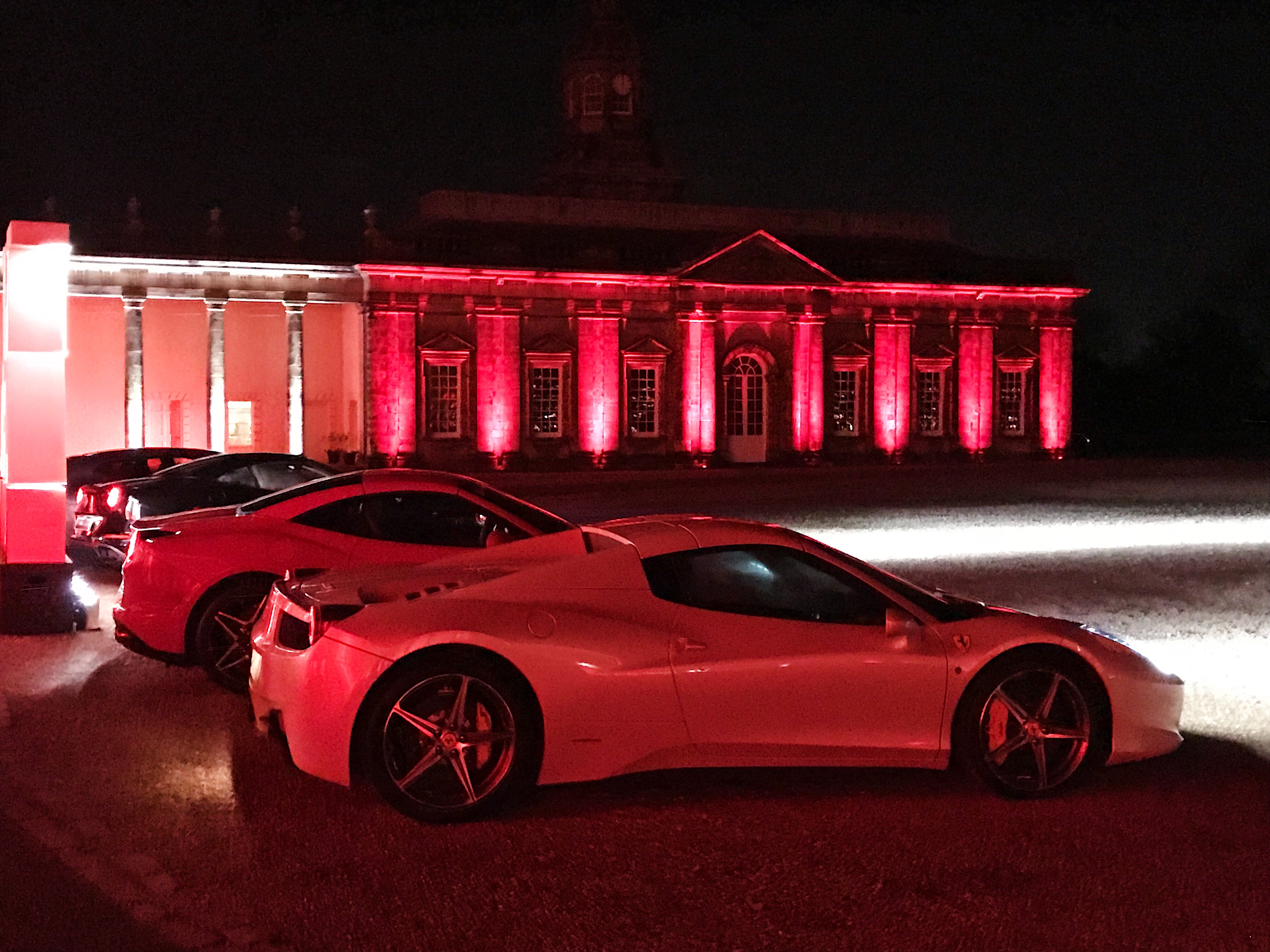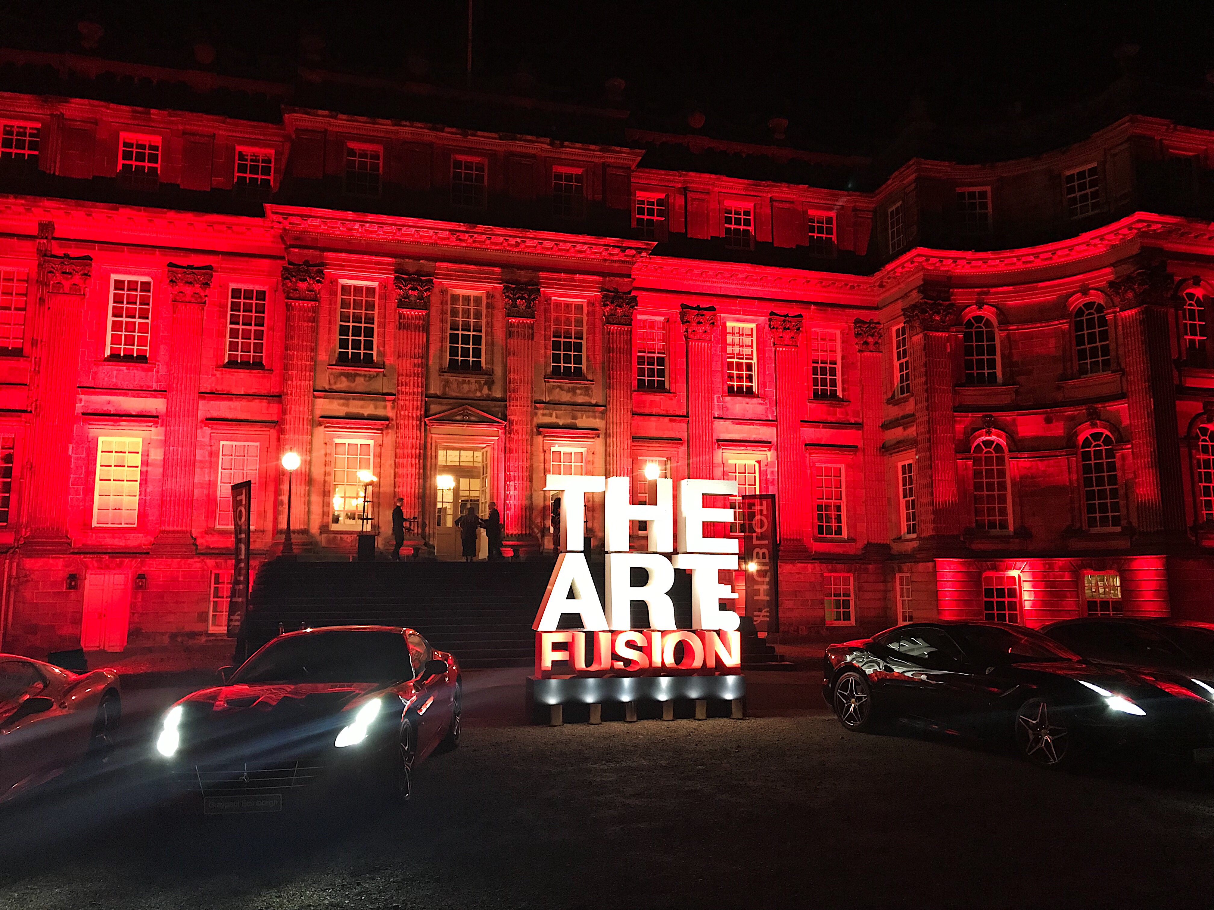 As the car slowly made its way up the long gravelled driveway, out of the darkness an impressive building that was Hopetoun House was lit up red . Stepping out , I could hear the roar from the convoy of Ferrari supercars that were halted in front of this stately home. Standing proudly in the the middle, a large sculpture in black, white and red reading ‘The Art of Fusion’.