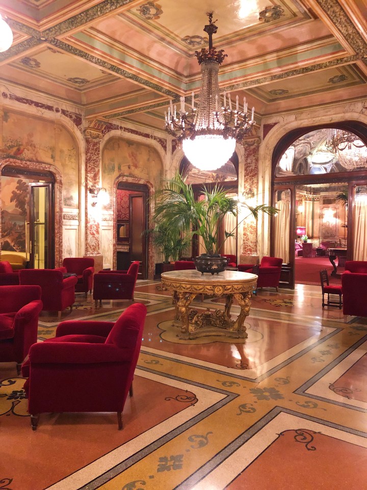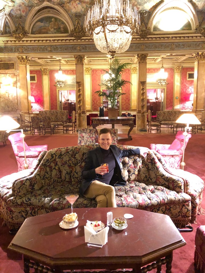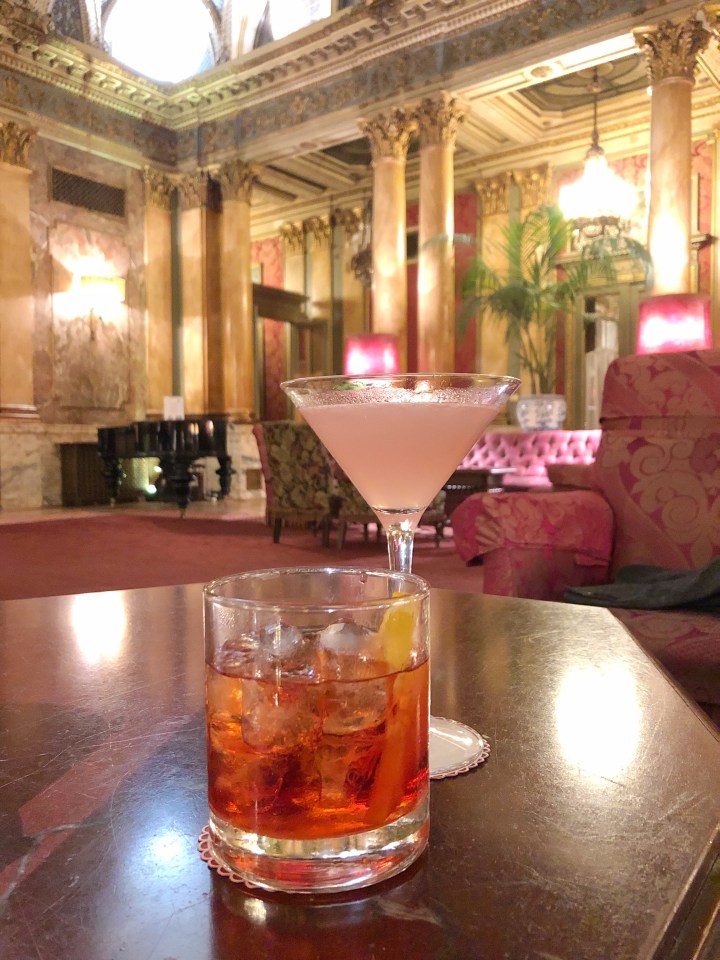 As you enter through its old wooden turnstile doors you are immediately transported to an opulent space. The lobby bar is extravagant in every way with oversized crystal chandeliers, intricate frescos on the ceiling and old-fashioned decadent furniture.