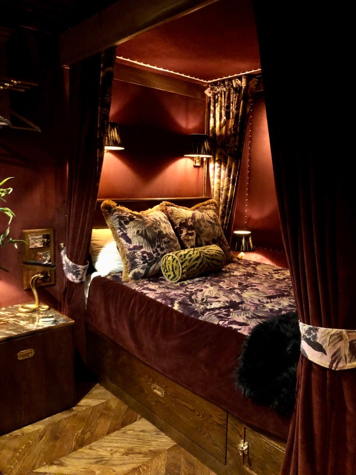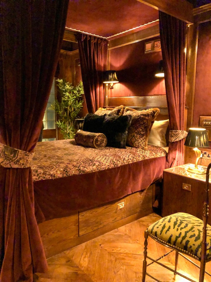 There are 30 rooms in the hotel split into three categories: The Cabin, The Classic and The Suite. I stayed in the classic room number 106 which was cosy and intimate. The hotel’s motto is “Beige is Blasphemy” which is clearly evident throughout. The interior decor is dark, opulent and sexy exuding a naughty but extravagant side. The first thing you notice is the beautiful four-poster bed which is draped in a deep red velvet lined with an elaborate floral design.