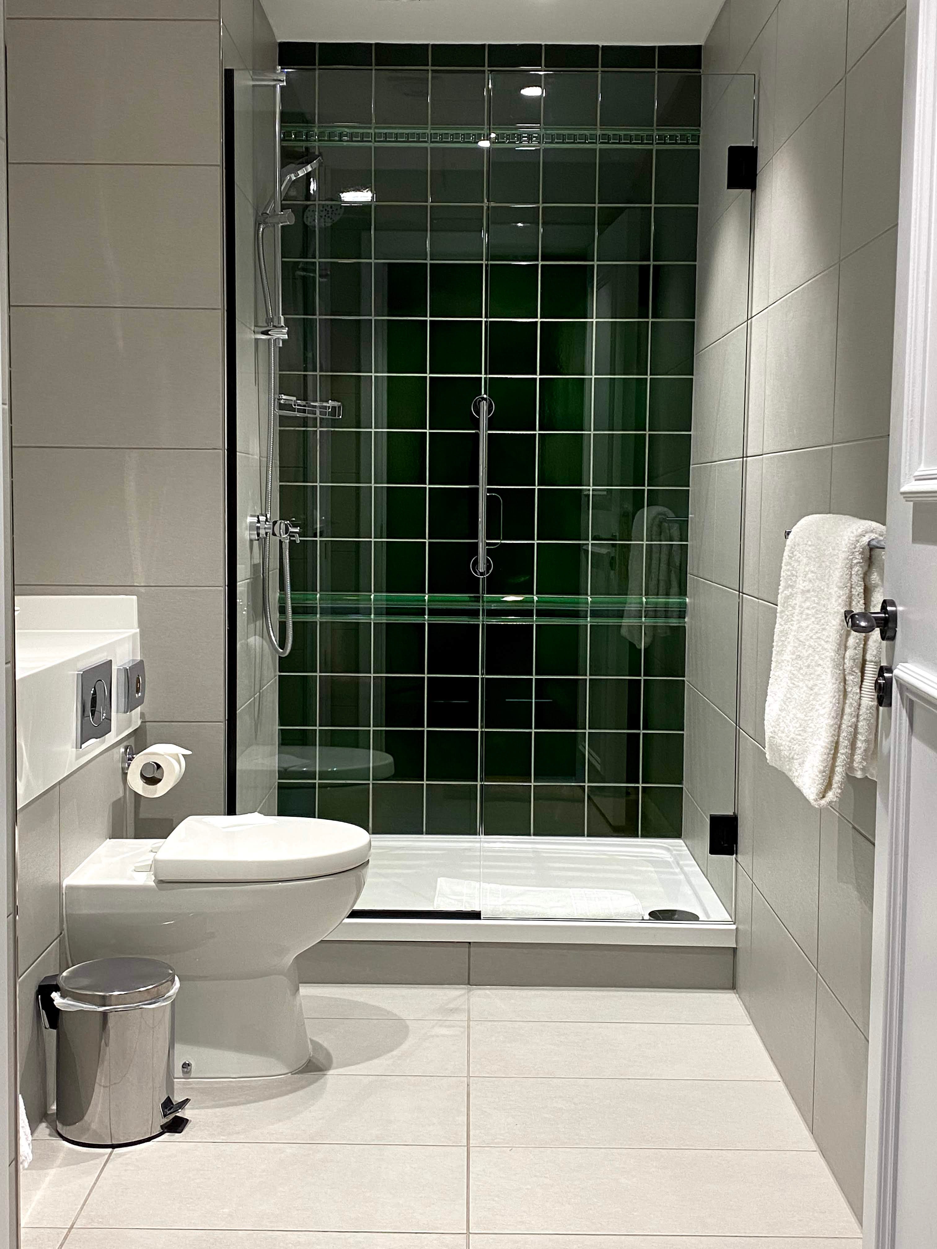 The separate bathroom is spotlessly clean, spacious, modern and includes luxury toiletries and fresh fluffy towels. The walk-in shower backed by forest green tiles was spacious and helped take that relaxation to the next level.