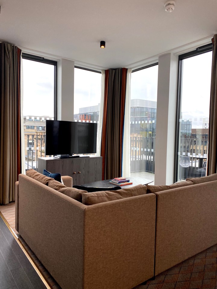 The large space combines a modern well-equipped kitchen, small dining table and comfortable lounge area all decked out with the latest amenities and technology. You can truly take advantage of the views with your very own terrace which wraps around the whole apartment, I was lucky enough to step out and enjoy the view before the rainy Scottish weather arrived (we had a huge storm that night).