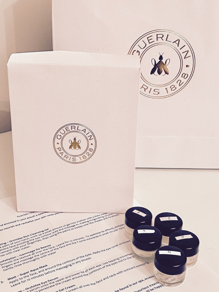 As facials cannot be carried out at the moment, Louise Banna, the Spa Senior Therapist, has cleverly created an at-home facial which allows you to experience Guerlain’s fantastic skincare products in the comfort of your own home. After a quick skin consultation, Louise compiled a small bag of products that aligned with my skincare concerns. Guided instructions and information regarding each product is also included, so you can sit back and enjoy the experience with ease.