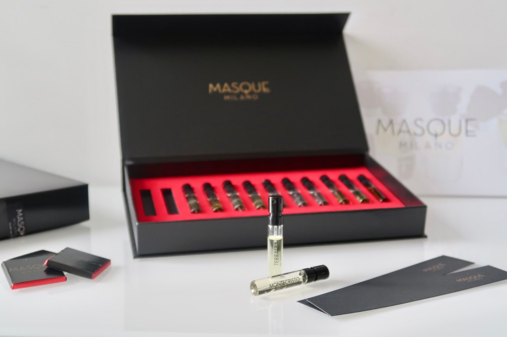 The wonderful fragrance house Masque Milano was created in 2013 by Allesandro & Riccardo who shared many similar interests. They sought out to create a range of fragrances to showcase Italian artistry and its many facets. I have attended a few online live fragrance releases with them this year and their enthusiasm and creativity is highly infectious. The discovery set includes 12 vials of their Opera Collection, housed in a slick black box lined with a vibrant red velvet.