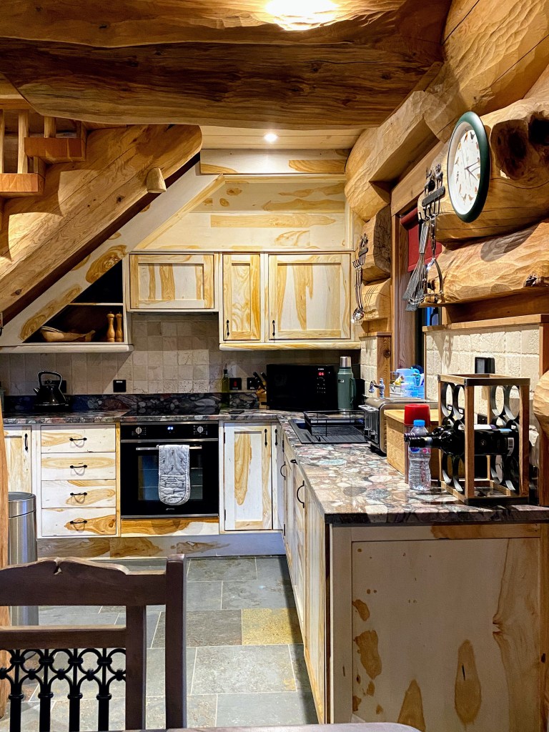 There are ten log cabins to choose from which can all hold different occupancies, ranging from 2 people up to a maximum of 6. Signposted with hand-crafted wooden signs, it is easy to navigate your way around the grounds to find your cabin, each one having their very own unique name. Although there are ten cabins, the grass laden roofs blend them into the environment and as they are adequately spaced out and scattered around the hillside, you feel like you are the only one there.