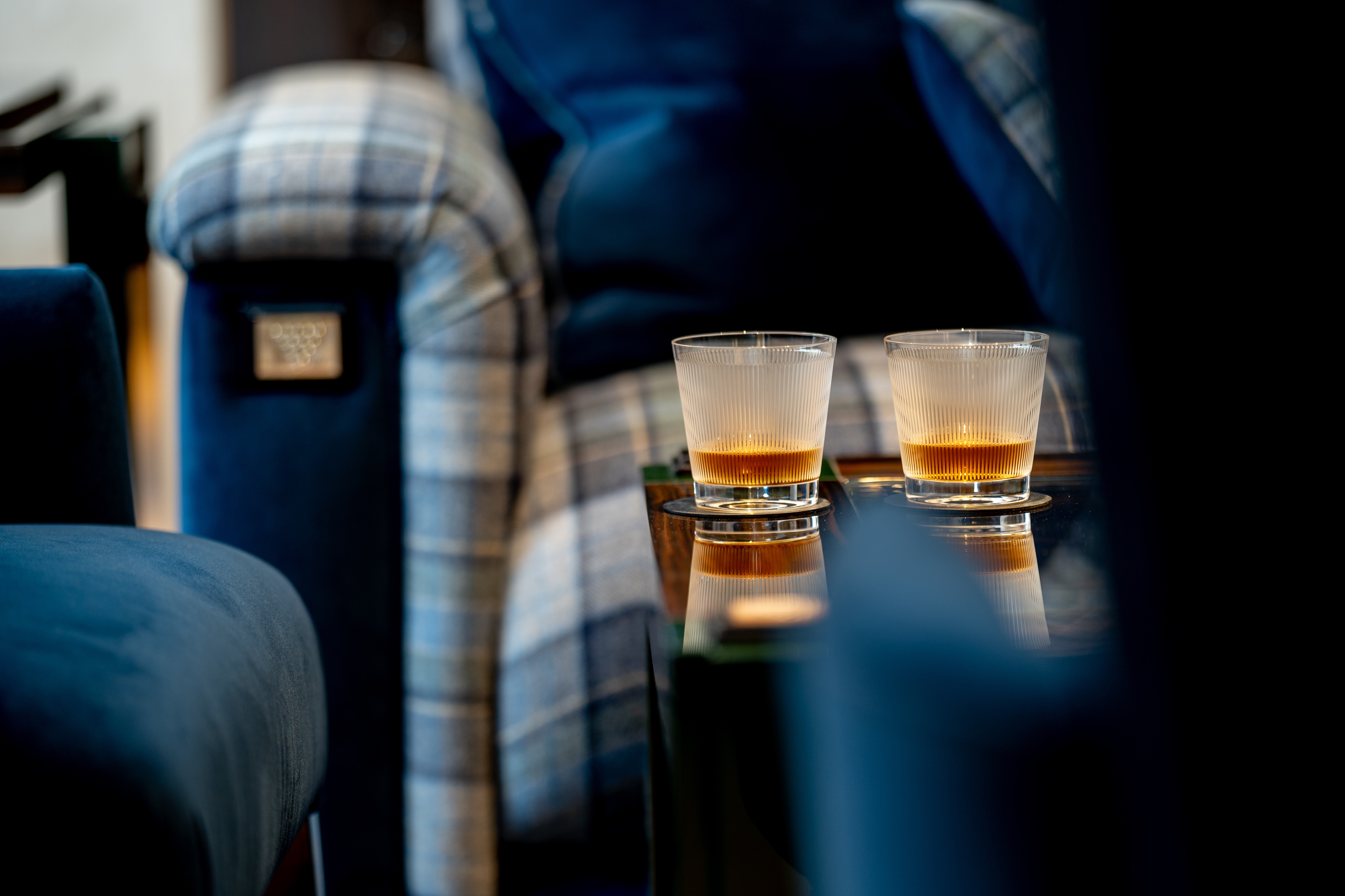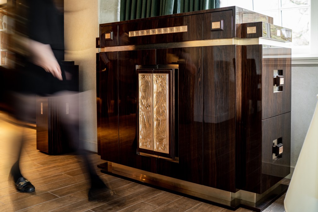 As you wander past the traditional distillery towards the restaurant and take in the sweet whisky aroma that hangs in the air, you begin to catch sight of numerous Lalique touches. The first is a chic sliding door with full panels of sculpted glass surrounded by elegant high-gloss walnut along with a stunning armoire.