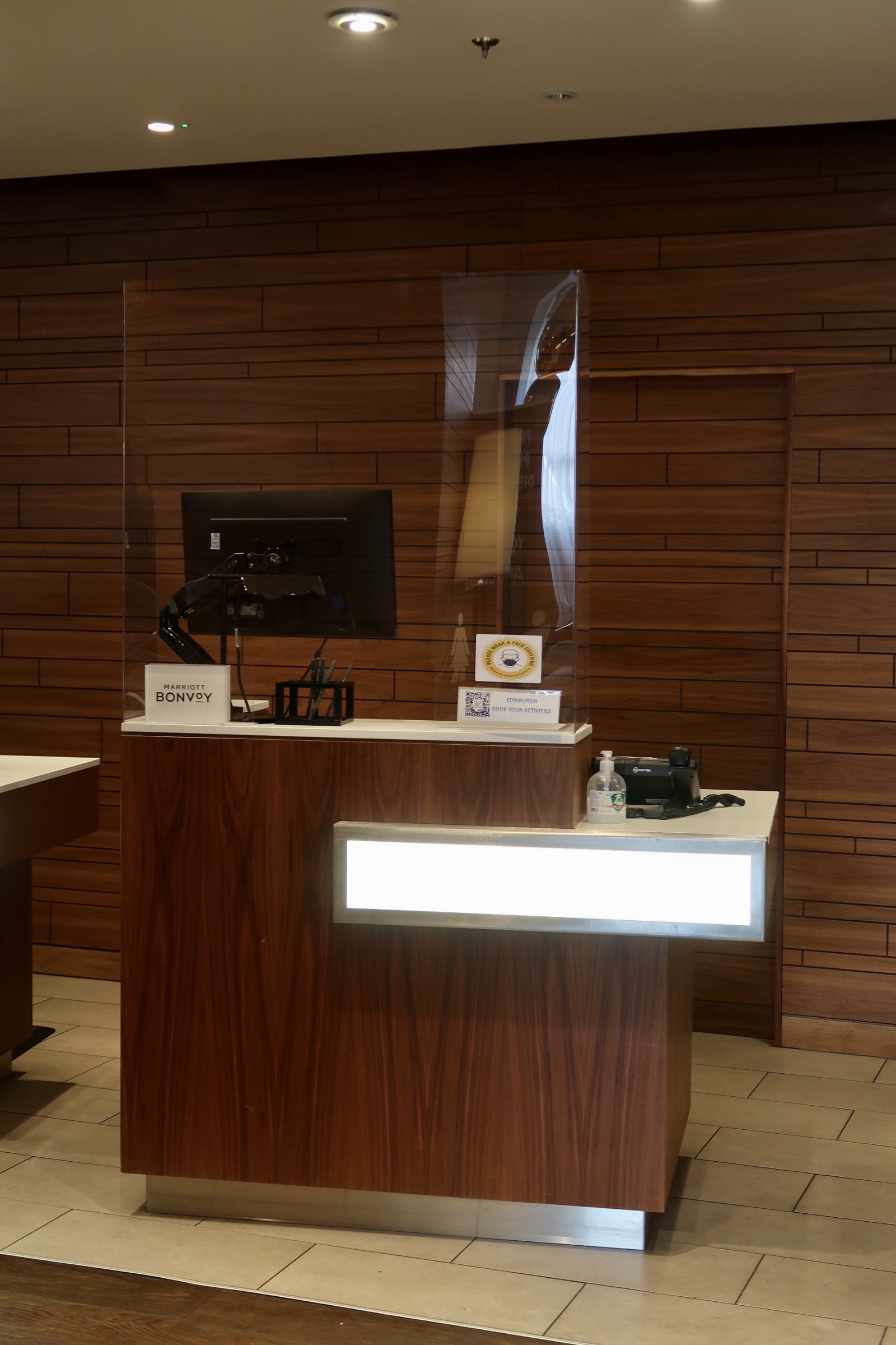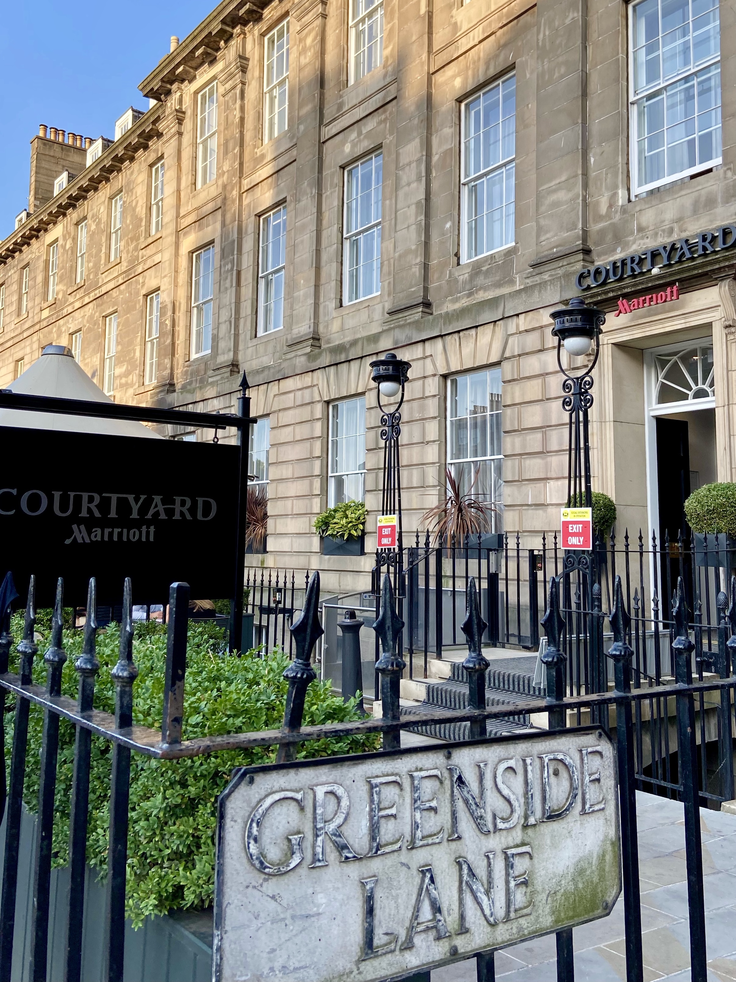 Situated in Edinburgh’s city centre at the foot of the iconic Calton Hill is the impressive four-star hotel, Courtyard By Marriot. Its prominent position makes it extremely accessible and acts an excellent base to explore everything this beautiful city has to offer. The exterior of the hotel exudes the typical Georgian style that Edinburgh is renowned for. The facade emits the style of an elegant townhouse with sash windows, symmetrical details and doors adorned with traditional fanlights. The energy and buzz of the nearby street are somewhat hectic but quickly disappears as you enter the hotel’s expansive lobby. Due to Covid restrictions, a one way system was in place, but with several reception desks located at the foot of the lobby and numerous friendly staff, check-in was a fairly quick.