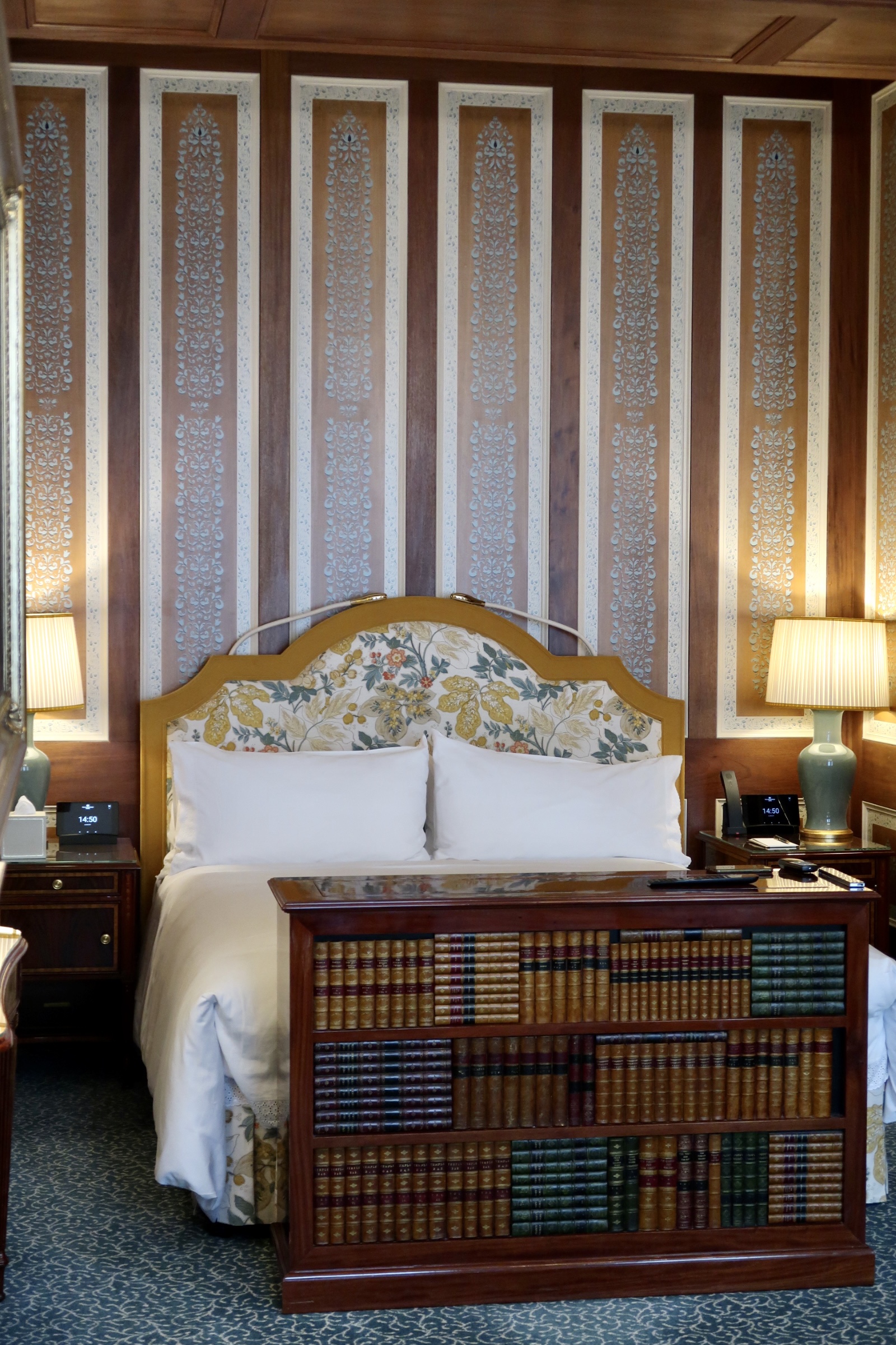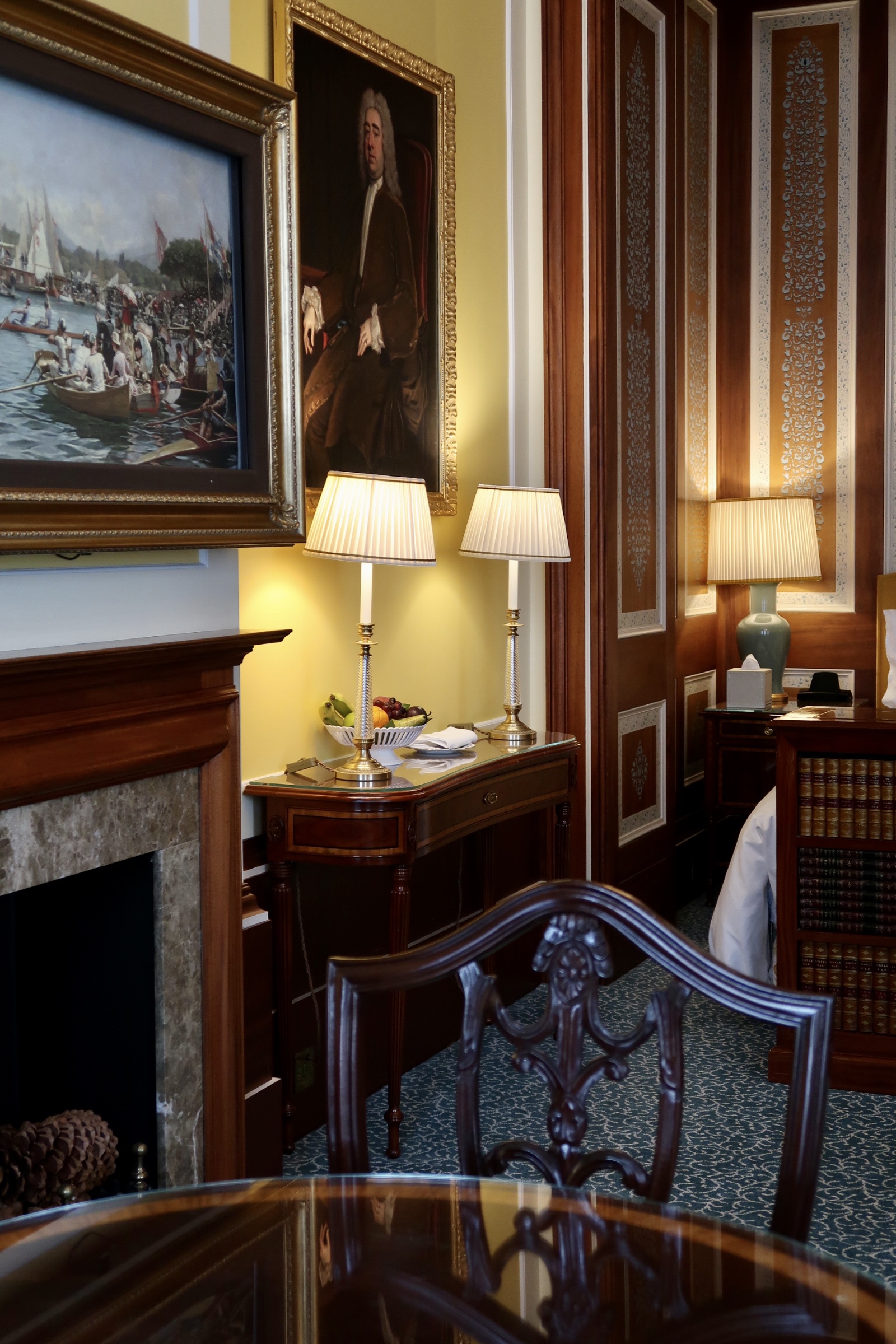 The lounge area has elaborately patterned seating around a small coffee table along with an adjacent dining table, perfect for a relaxing drink or if you later choose to dine within your suite. I was especially enamoured with the intriguing artwork above the fireplace which on the touch of a button, raises to reveal a hidden television beneath. This suite also includes a separate writing desk with charging points, stationery and telephone which came in handy for business.