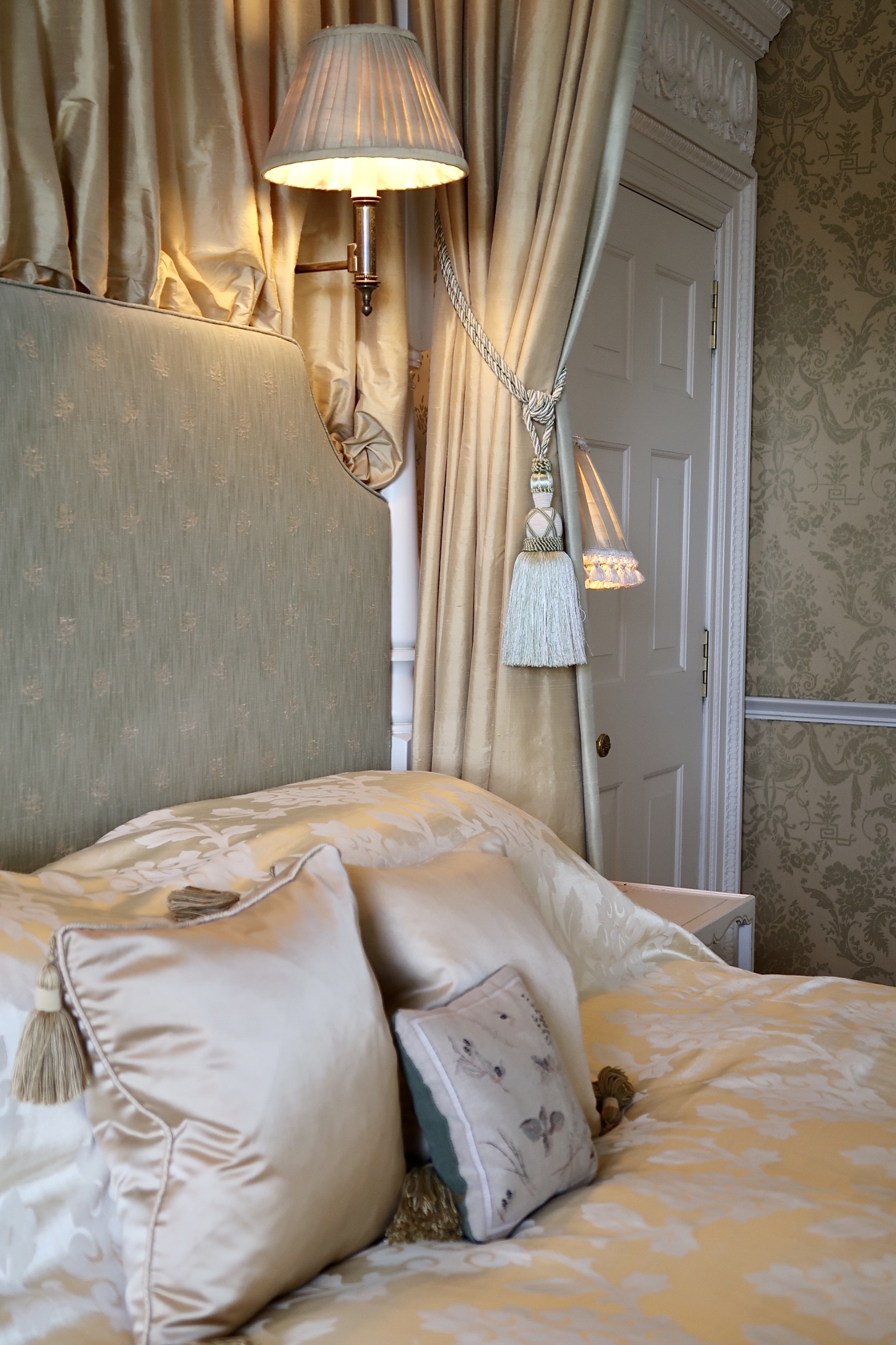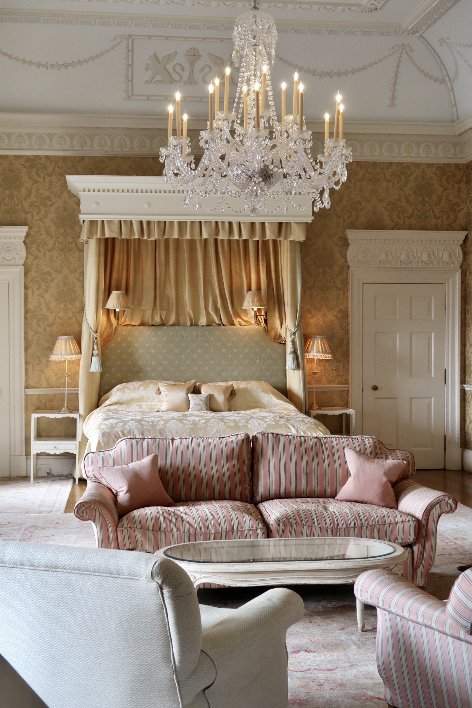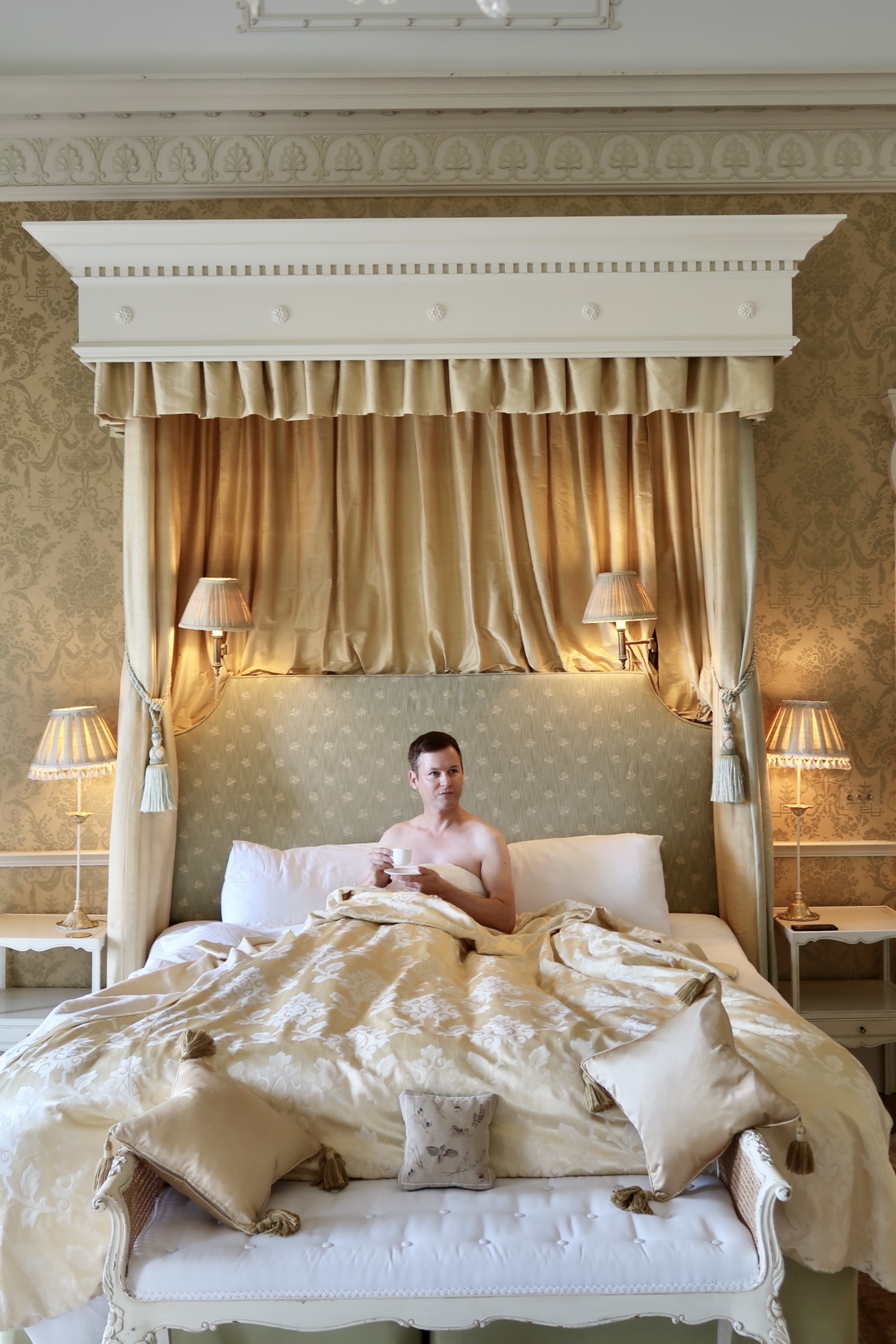 On entering its double doors I was completely taken aback by the palatial size of the suite. The room was decorated in a calming hue of creams, yellows and golds, all balanced with an injection of dusky pink from its soft furnishings. Its high-domed ceilings with intricate cornicing were simply breathtaking, elegantly crowned with a large glistening chandelier. Floor to ceiling sash windows draped in opulent curtains graced one side of the room, allowing the summer sun to stream in and provide a glimpse of the estate grounds outside. The opposite side was adorned with artwork, a mirror and a trolly filled with bottled water, Archerfield’s Fletcher’s Cottage Gin liqueur and a welcomed selection of lavishly filled Cannoli’s.
