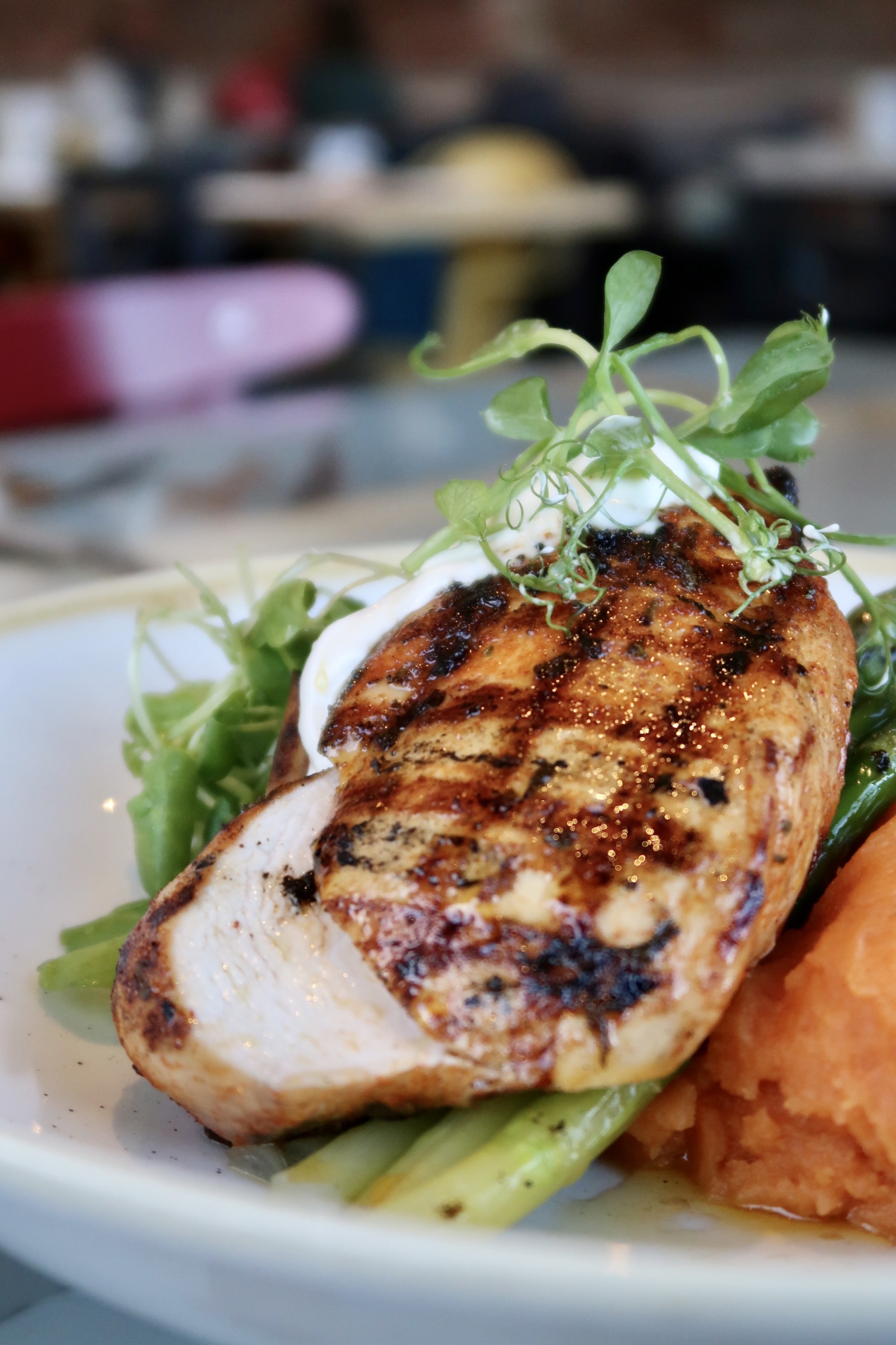 From The Kitchen’s Marvellous Mains my partner selected the Homemade beef burger served on a soft brioche bun, crunchy gem lettuce and a tomato chilli jam accompanied with French fries. I chose the Smoked paprika, lime and coriander marinated chicken breast with a perfectly smooth sweet potato mash, asparagus spears and a refreshing citrus crème fraîche.