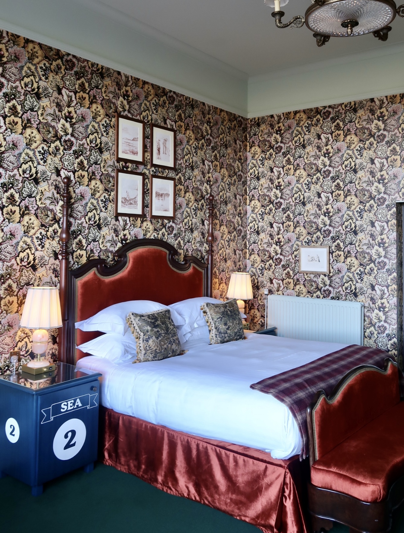 The prominent wooden carved bed embellished with velvet-covered terracotta headboard sits against an elaborate flocked wallpaper, a talking point with many of the guests. At the foot of the bed sits a comfortable velvet bench, matching perfectly with an array of dark coloured wooden furniture situated around the room. In complete contrast, bedside cabinets designed to look like sea-side lockers added a little fun element to the design. As well as the bed, the room also included an elegant desk area, two cupboards (one walk-in) and the addition of seating near the window to enjoy those excellent views. The room included an array of amenities such as a Nespresso machine, tea/coffee making facilities, mini bar, hairdryer, iron/iron board and a flat-screen TV. I particularly enjoyed the addition of complimentary Eden Mill Golf gin and chocolate by Coco Chocolatier. The bathroom, although practical was a little disappointing, its style displaying hints of the hotels beige past. I am unsure if this has still to be updated but it certainly doesn’t reflect the standards of the rest of the room.