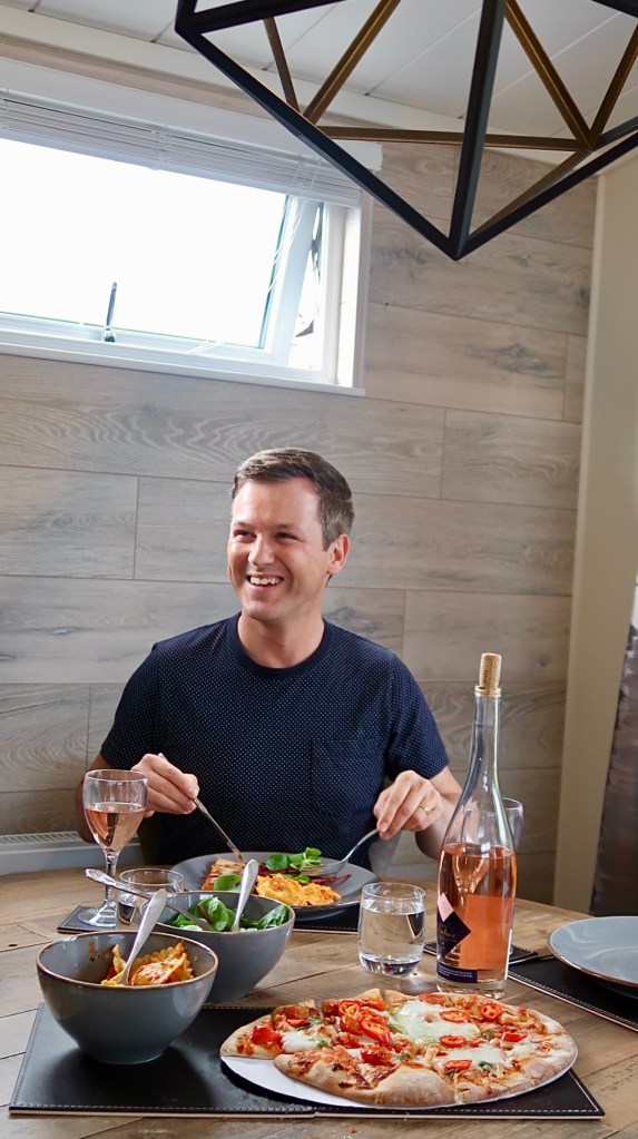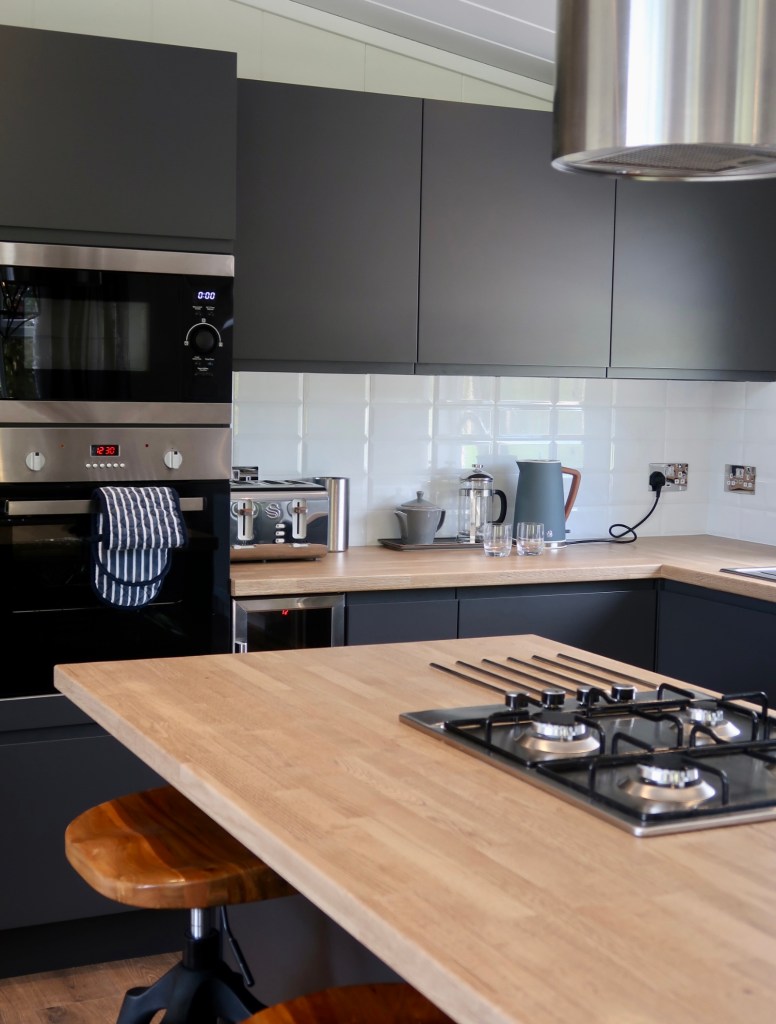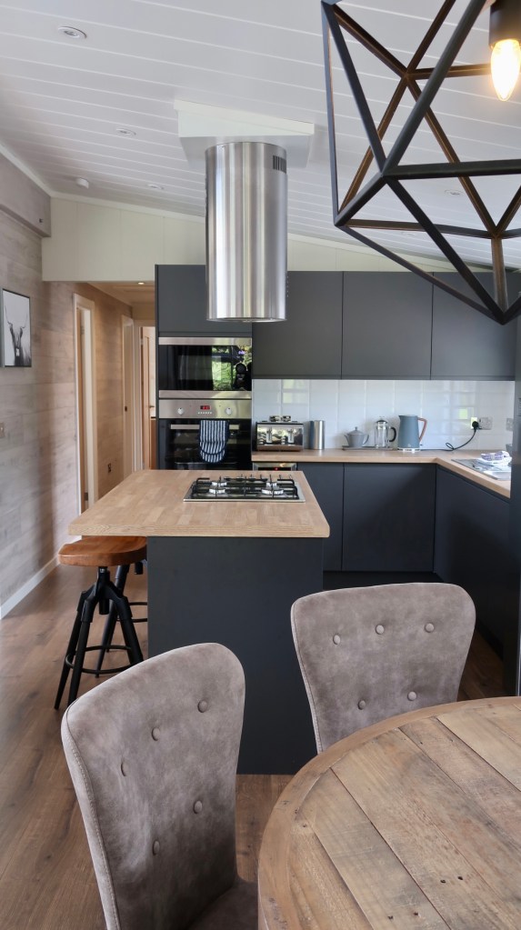 The lounge with two comfortable sofas looked onto a large flat screen tv and electric log fire, making it the perfect place to chill with friends and enjoy an evening of movies. The well-equipped kitchen finished in charcoal grey had everything we could need to take full advantage of our self-catering experience, including; an American-sized fridge/freezer, gas cooker, dishwasher, wash machine, microwave and wine cooler. The adjacent kitchen island was an attentive addition, allowing the person who is cooking to still be able to socialise with guests at the same time. A breakfast bar and large dining table provided plenty of space to dine and enjoy the delights of those encompassing vistas. To top up your food supplies there is a small on-site shop in reception which sells essentials, including fresh eggs laid by the adorable chickens that wander the grounds. Although there are no restaurant facilities on site, a new cafe and takeaway will be opening soon providing a selection of sandwiches, cakes and drinks etc.