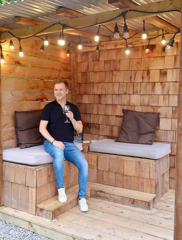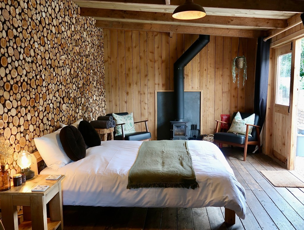 There are three bespoke cabins on-site, each with their own charm. We stayed in Wild Heart Cabin, and from the moment I stepped inside, I felt completely at home. Warm, rustic, and undeniably quaint, the space features a cosy double bed backed by stacked wooden log slices, a charming seating area, and a wood-burning stove. We didn’t need it though, thanks to the glorious Welsh sunshine that weekend.