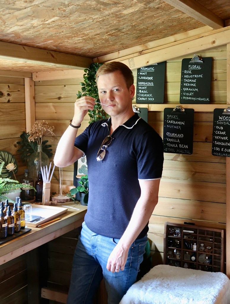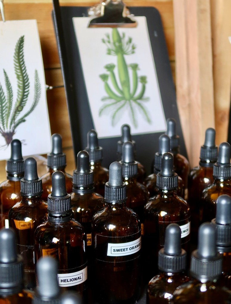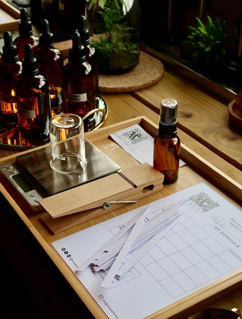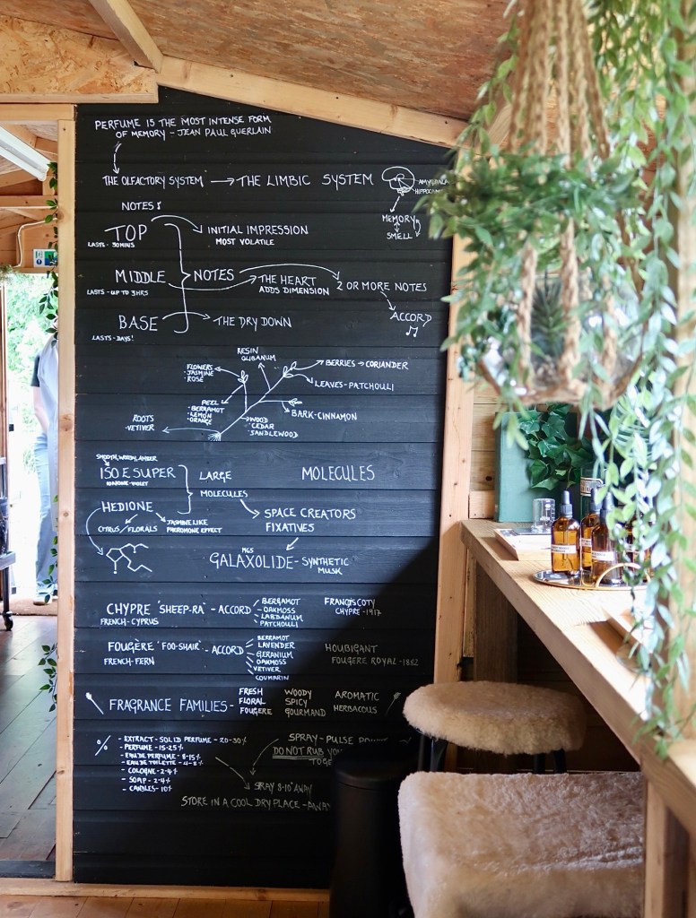 The on-site lab overlooks the garden and welcomes visitors daily, all eager to create a bespoke fragrance under Louise’s expert guidance. Walking into the space felt like stepping into a fragrant apothecary dream — bottles gleaming in the sunlight, raw materials lining the walls, and antique perfume diagrams lending a vintage charm.